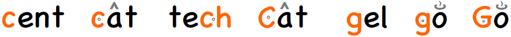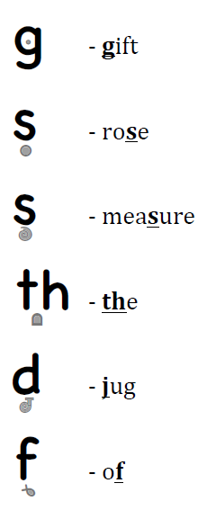 Unmarked ‘c’ and ‘g’ hold their soft sounds as in the letters’ names. Their SPS, uniquely, lie within the body of the text (intrascript) and act to ‘harden’ the sounds of these letters, providing the ‘k’ sound and the sound of ‘g’ as in ‘get’ respectively. E.g.