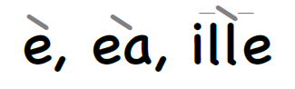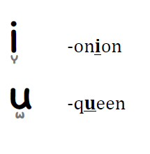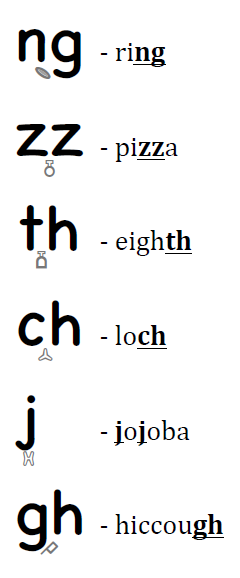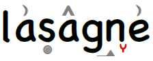 Where a consonant phoneme ends with a ‘w’ or ‘y’ sound (eg. gn in lasagne) this SPS lies to the extreme right under the last letter in the consonant grapheme to indicate it is the last sound of the phoneme. E.g.