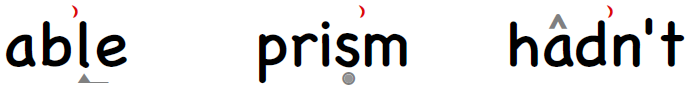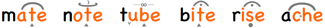 Where the letter ‘e’ at the end of a syllable appears to elongate the preceding vowel (e.g mat -> mate, bit -> bite), the vowels, separated by consonant(s), are connected by the appropriate vowel SPS. A small indicator triangle beneath the consonant(s) indicates that they should be pronounced at the end of the syllable. If the consonant(s) are marked with SPS, it is these that will indicate that they must be pronounced. E.g.