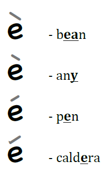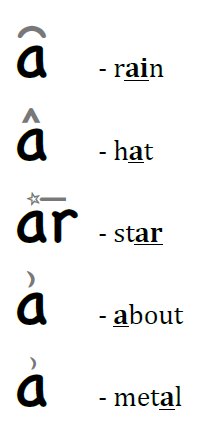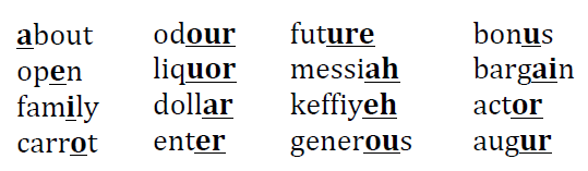 The unstressed vowel sound, know as schwa, can be represented by these letter combinations among others. (Right Insert)