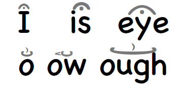 SPS are printed in grey which distinguishes them from the text, affirming them as a temporary aid to students learning to grasp the rules of letter patterns and words, on their way to becoming independent and fluent readers.