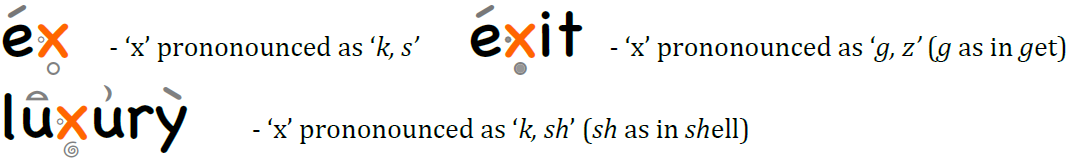 Where the letter ‘x’ consists of two sounds for the one grapheme, the first is a hard ‘c’ or ‘g’ and its SPS is placed in the centre-left of the ‘x’. The SPS for the second is placed beneath the ‘x’. E.g.